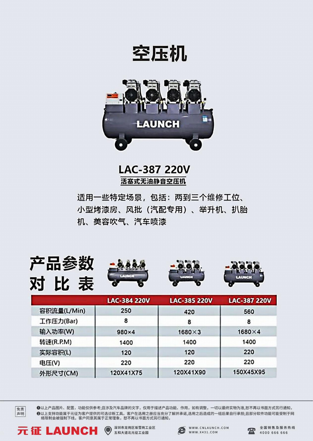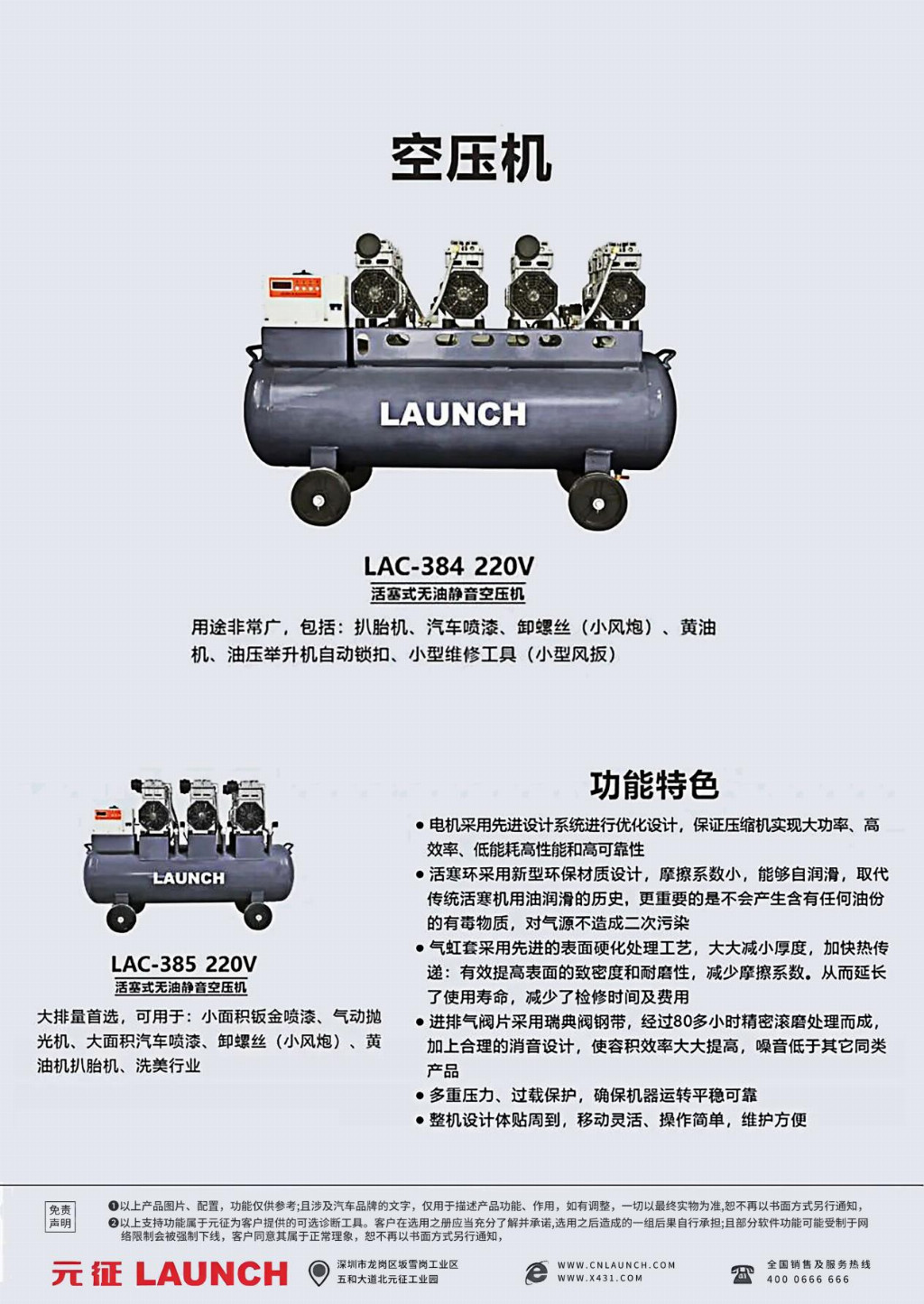 元征(launch)活塞式无油静音空压机,以多型号适配全场景、卓越功能铸就核心优势、清晰参数助力精准选择的特点,成为工业生产与生活服务领域的高效动力伙伴。无论是追求高效生产的企业,还是注重服务质量的商家,选择元征空压机,都能为工作带来更强劲、更可靠、更便捷的动力支持,推动事业不断向前发展。