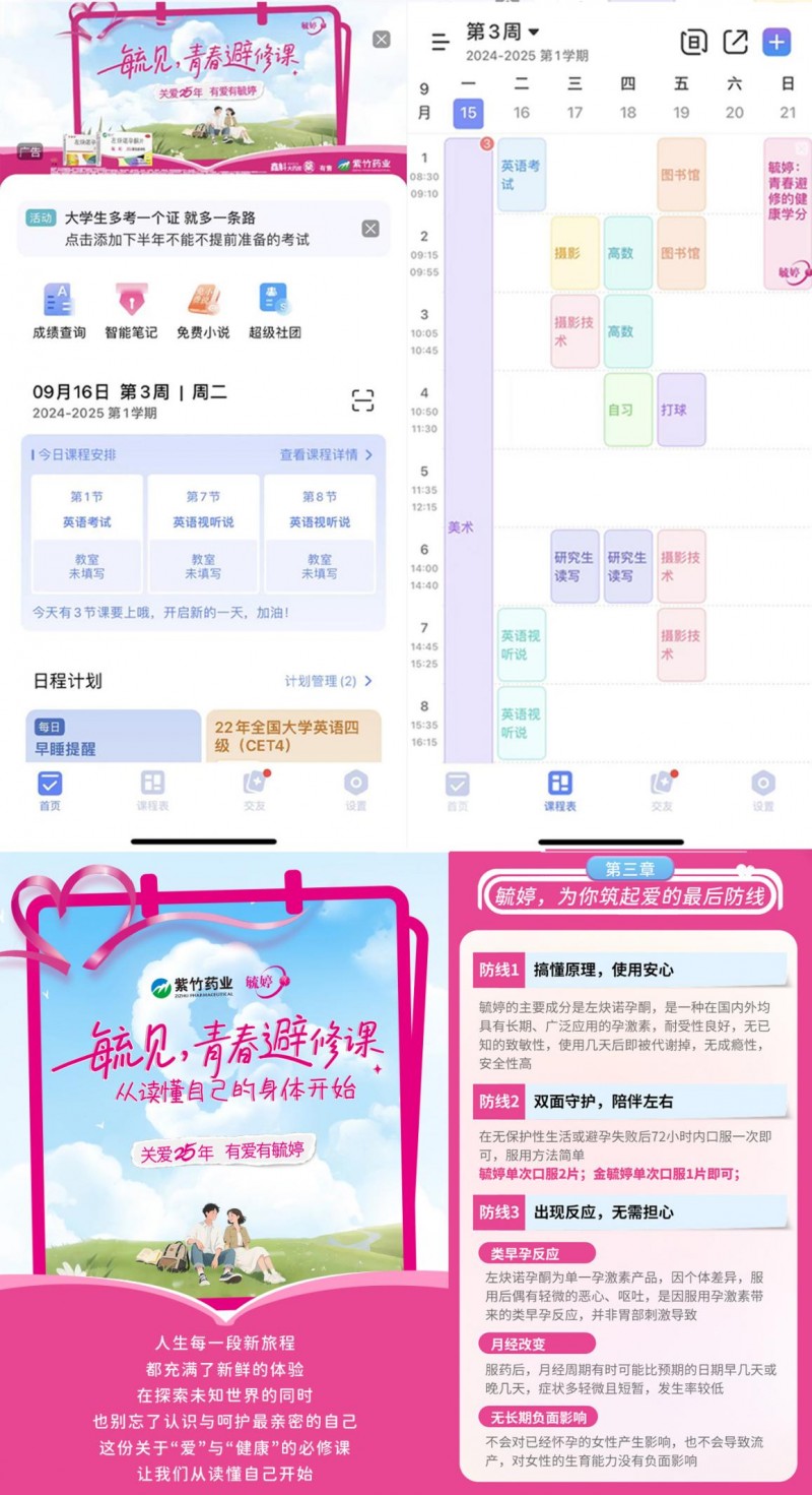 特别是毓婷与“超级课程表”的合作,精准切入大学生群体。通过课程表界面嵌入、小纸条推送、k8凯发国际旗舰厅首页推广等自然融入日常学习场景的方式,将“青春避修课”相关内容无缝对接至学生的校园生活,持续传递传播女性生理健康与科学避孕等实用知识。此外,美图秀秀k8凯发国际旗舰厅首页的曝光资源也为本次活动带来广泛关注,进一步扩大了传播声量。